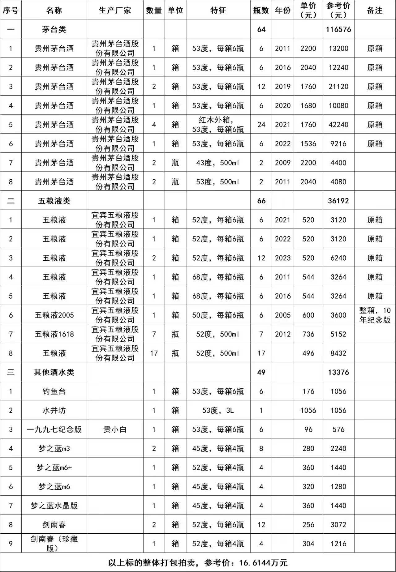 1、贵州茅台酒计64瓶、五粮液酒计66瓶及其他类酒水计49瓶,整体打包拍卖,参考价:16.6144万元,竞买保证金:2万元。标的详情见下方清单: