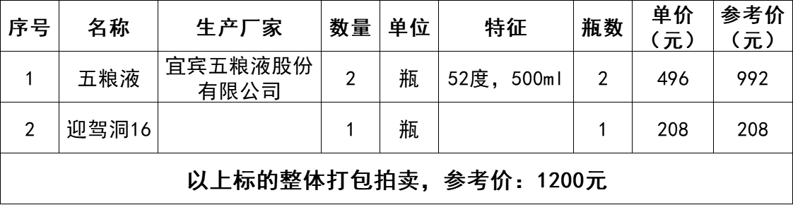 2、五粮液酒2瓶、迎驾洞藏16酒1瓶,整体打包拍卖,参考价:1200元,竞买保证金:1000元。标的详情见下方清单: