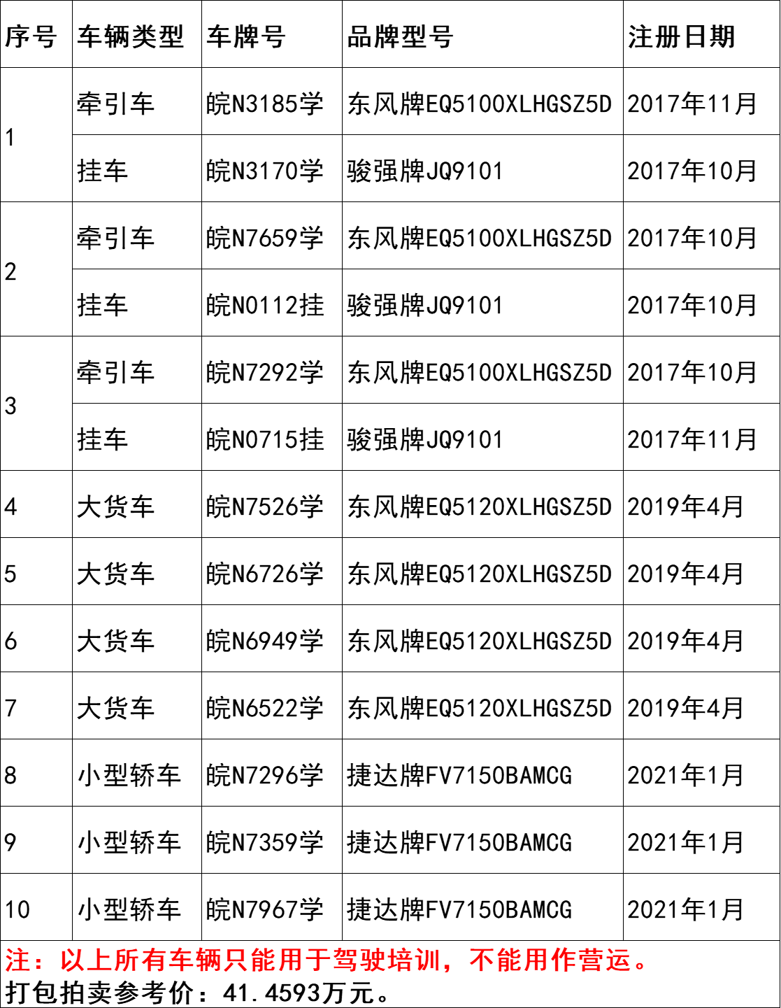 3、皖N3185学/皖N3170学牵引挂车、皖N7526学东风牌大货车、皖N7296学捷达牌小型轿车等10辆二手车,打包拍卖。参考价:41.4593万元,竞买保证金:5万元。标的详情见下表: