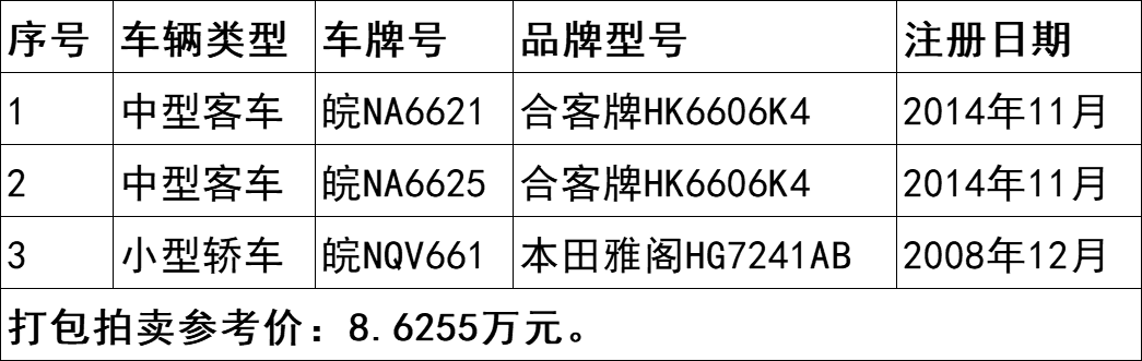 2、皖NA6621合客牌中型客车、皖NA6625合客牌中型客车、皖NQV661本田雅阁小型轿车等3辆二手车,打包拍卖。参考价:8.6255万元,竞买保证金:1万元。标的详情见下表:
