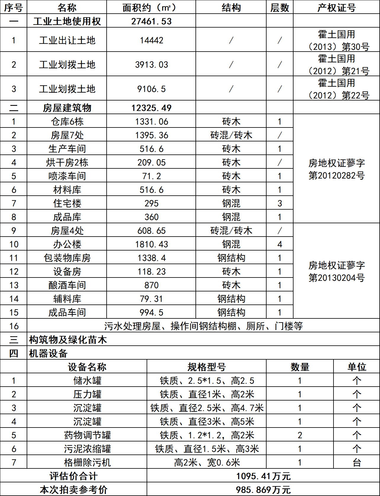 (2)房屋建筑物:仓库、生产车间、烘干房、办公楼、住宅楼等,总面积约12325.49㎡;
