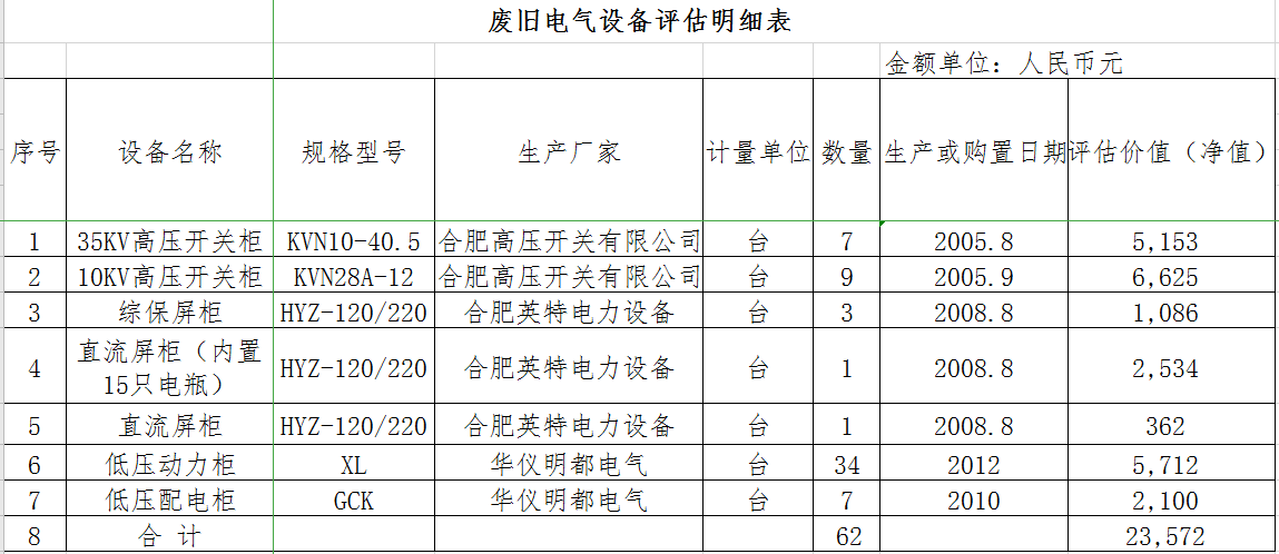 1、废旧电缆、高压开关柜、低压配电柜等物资一批,整体拍卖,参考价:23.376万元;