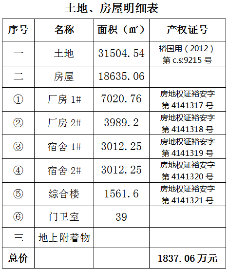 一、拍卖标的:位于六安市城南镇高新技术产业开发区(原裕安经济开发区)振东大道,安徽华涛电子有限公司破产财产,包括:工业用地31504.54㎡,约47.3亩,土地证号:裕国用(2012)第c.s:9215号;厂房、办公楼、宿舍楼等房产,总建筑面积约18635.06㎡,其中:1#厂房建面7020.76㎡;2#厂房建面3989.2㎡;1#宿舍建面3012.25㎡;2#宿舍建面3012.25㎡;综合楼建面1561.6㎡;门卫室建面39㎡。以上标的以及地上附着物整体拍卖,参考价1837.06万元。拍卖详情见竞拍人须知,请向拍卖公司索取。