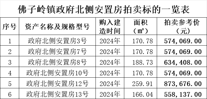 3、2025年1月24日16时拍卖:佛子岭镇政府北侧安置房6套,总建筑面积约1127平方米,土地性质为国有划拨土地,本次拍卖不含土地。(详情及拍卖参考价等见下方附表↓)