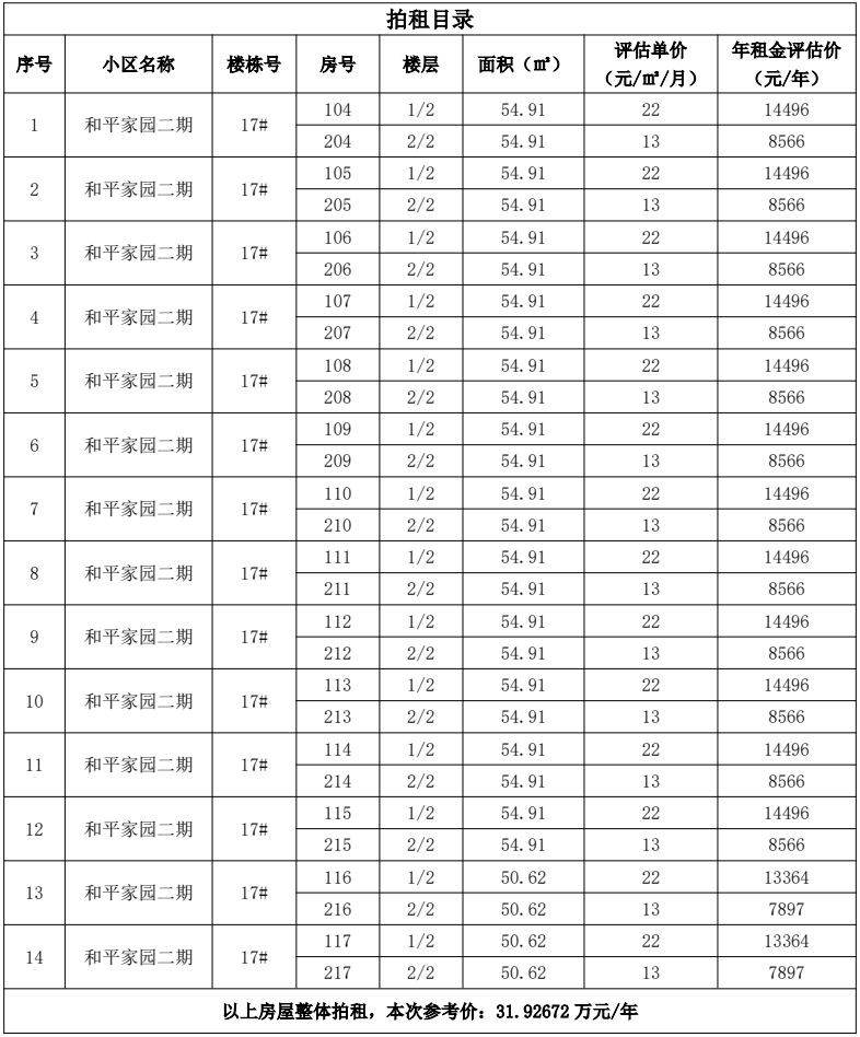 和平家园安置小区二期17#楼14套商业用房3年期租赁经营权,整体面积为1520.32㎡,整体拍租,参考价:31.92672万元/年。竞租保证金:5万元。