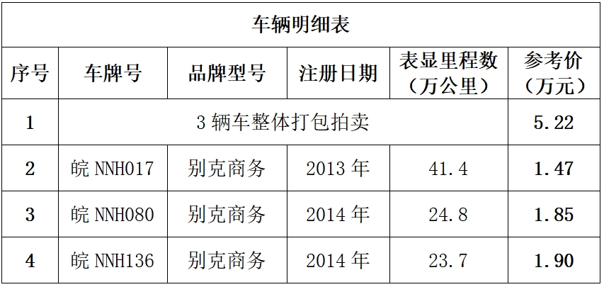 一、拍卖标的:皖NNH017别克商务、皖NNH080别克商务、皖NNH136别克商务等3辆二手车,优先整体打包拍卖,参考价:5.22万元,整体拍卖不成,再分拆单个标的进行拍卖。拍卖标的详情见下表: