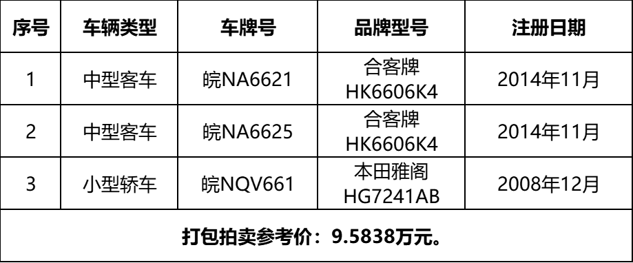 3、皖NA6621合客牌中型客车、皖NA6625合客牌中型客车、皖NQV661本田雅阁小型轿车等3辆二手车,打包拍卖。参考价:9.5838万元,竞买保证金:1万元。标的详情见下表: