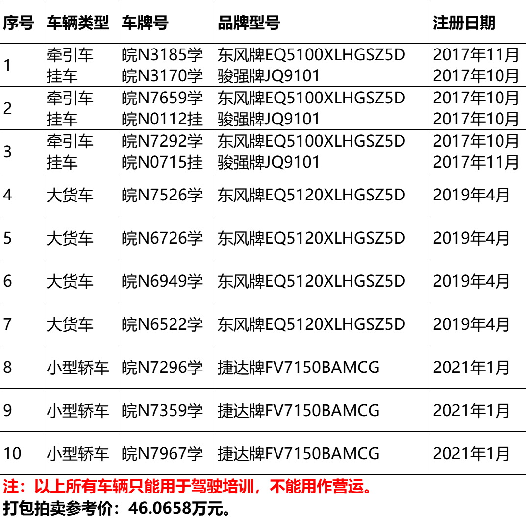 4、皖N3185学/皖N3170学牵引挂车、皖N7526学东风牌大货车、皖N7296学捷达牌小型轿车等10辆二手车,打包拍卖。参考价:46.0658万元,竞买保证金:5万元。标的详情见下表: