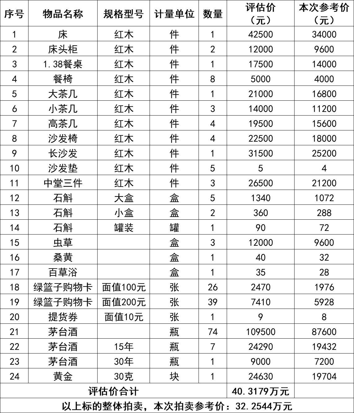 一、拍卖标的:茅台酒、黄金、红木家具等物品一批,整体打包拍卖,参考价:32.2544万元。竞买保证金:6万元。详见下方明细表: