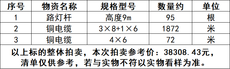 一、拍卖标的:废旧物资一批,包括道路灯杆、铜电缆等,参考价:38308.43元。竞买保证金:1万元。