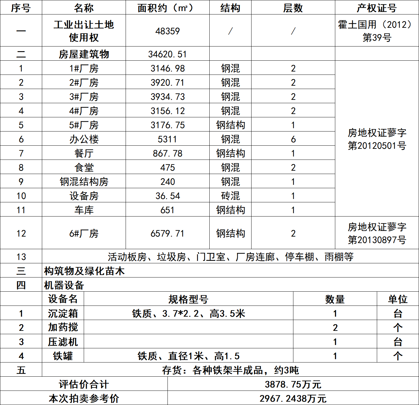 1、安徽华安达集团工艺品有限公司位于霍邱城北工业园的工业房地产、构筑物、绿化苗木、机器设备及存货等,包括: